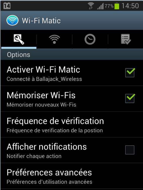 En fonction de la position géographique détectée par le téléphone, Wi-Fi Matic est un programme pour Android gratuit et en français qui va activer ou désactiver automatiquement la fonction Wi-Fi de l’appareil. En effet quand aucun réseau Wi-Fi n’est à portée, le téléphone passe sont temps à essayer d’en trouver un de disponible ce qui a pour effet de décharger la batterie en deux temps trois mouvements. Cet automatisme peut faire aussi économiser de la consommation data sur son forfait. Pour déterminer la position géographique Wi-Fi Matic ne se sert pas du GPS du téléphone, lui aussi consommateur d’énergie, mais la détermine via les antennes des opérateurs de téléphonie mobile. Une fois que le programme est correctement configuré, le téléphone ne se connectera que sur les réseaux Wi-Fi sur lesquels on a l’habitude de se connecter.