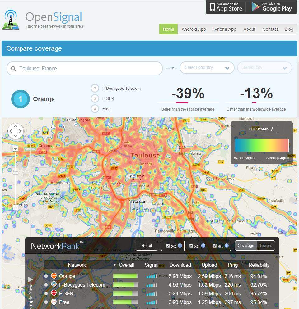 OpenSignal a une interface en anglais, mais chacun devrait comprendre comment le site fonctionne. Pour chaque zone affichée sur la carte (pays, région, ville, quartier…), on dispose de la liste locale des opérateurs de téléphonie à même de fournir leurs services avec leur couverture réelle. Une comparaison est effectuée à l’échelle du pays ou pour l’ensemble du monde matérialisée par deux pourcentages.