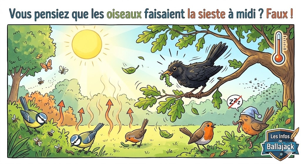 Si vous avez la chance d’avoir un jardin ou d’habiter près d’un parc, vous avez certainement déjà remarqué ce phénomène. À 5h du matin, c’est un véritable concert symphonique qui vous réveille. Les oiseaux s’en donnent à cœur joie. Puis, vers 8h, l’agitation commence à se calmer. Et quand arrive midi, c’est le silence presque complet… Plus un seul gazouillis à l’horizon.