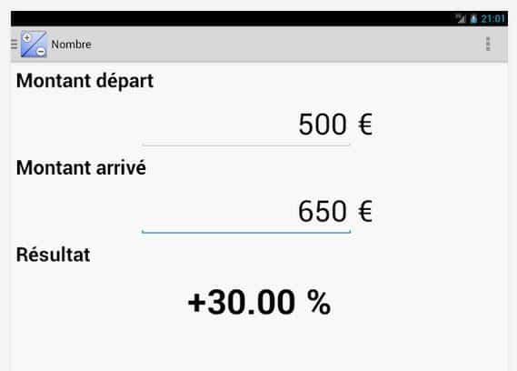 - Nombre : Pour à partir de deux montants (montant de départ et montant d’arrivée) calculer l’augmentation ou la diminution en pourcentage entre ces deux valeurs ; par exemple pour savoir qu’entre les valeurs 500 et 600, il y a une variation de + 20 %.