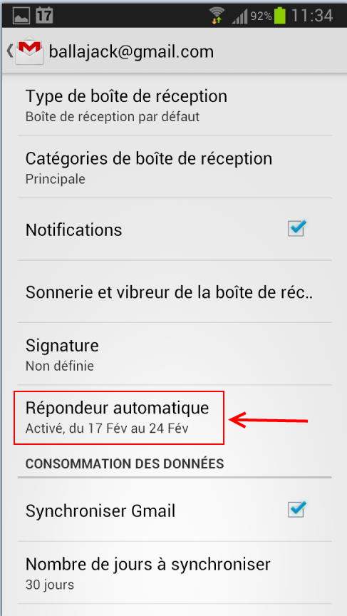 Cette lacune n’est plus d’actualité puisque la version 4.7 de Gmail (et les suivantes) pour Android prévoit cette fonctionnalité. On accède au gestionnaire d’absence depuis les paramètres de l’application Gmail. Si plusieurs comptes Gmail sont configurés sur le smartphone, on peut configurer un gestionnaire d’absence individuellement pour chacun d’entre eux en sélectionnant les comptes à prendre en compte l’un après l’autre.